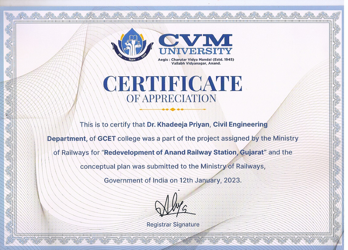 Dr. Khadeeja Priyan, Professor & Head of Civil Engineering department received Certificate of Appreciation for her significant contribution in being part of the project assigned by Ministry of Railways for "Redevelopment of Anand Railway Station, Gujarat" and for submitting the Conceptual Plan to the Ministry of Railways, Government of India. |