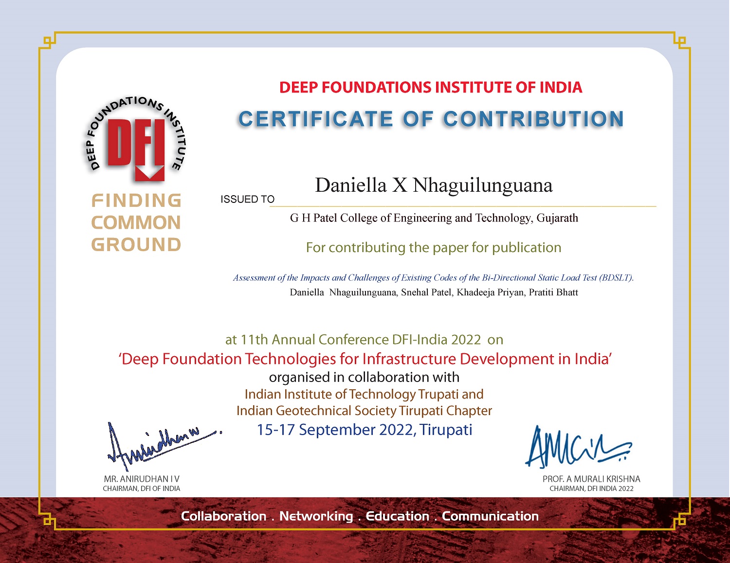 Ms. Daniella Nhaguilunguana student of the Civil Engineering department (2018-2022) presented and published a paper on "Assessment of the Impacts and Challenges of Existing Codes of Bi-Directional Static Load Test (BDSLT)" under the guidance of Dr. Khadeeja Priyan, Snehal Patel and Pratiti Bhatt at 11th Conference DFI-India 2022 on Deep Foundation Technologies for Infrastructure Development in India organized by Deep Foundations Institute of India in collaboration with Indian Institute of Technology Tirupati and Indian Geotechnical Society Tirupati Chapter at Tirupati. |