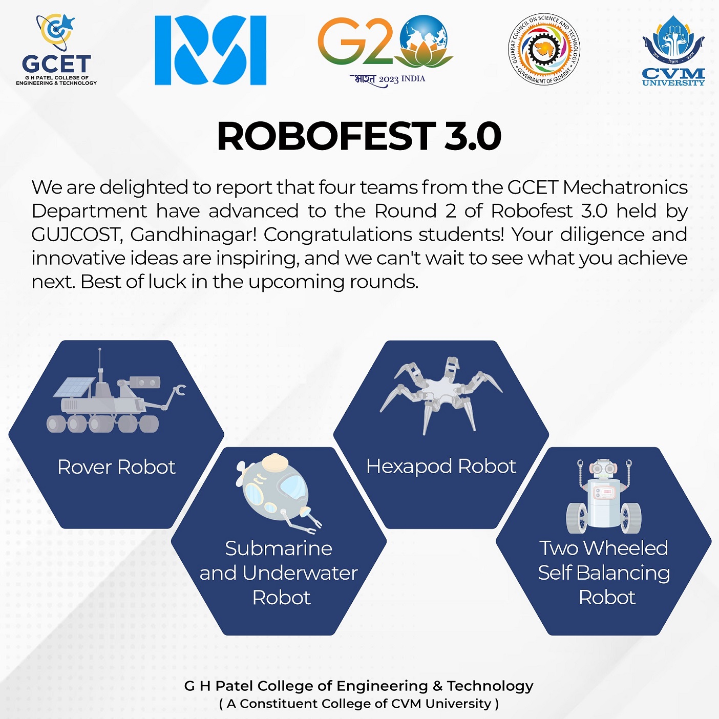 Proud moment for GCET,(Mechatronics Department) Four Teams from GCET (Mechatronics Department) have qualified for the Round 2(Proof of Concept) of Robofest 3.0 competition held by GUJCOST, Gandhinagar. From which GCET is shortlisted in four categories, 1) Rover Robot 2) Submarine and Underwater Robot. 3) Hexapod Robot 4) Two Wheeled Self Balancing Robot Each of team will receive a cash prize of Rs. 50,000/- from GUJCOST -DST. Total price money for four team Rs. 2,00,000/- It's wonderful to hear that four teams from GCET have qualified for Round 2 (Proof of Concept) of the Robofest 3.0 Competition organized by GUJCOST in Gandhinagar. This is indeed a remarkable accomplishment for your institution. Participating in robotics competitions like Robofest demonstrates the dedication, skills, and hard work of the teams involved. It's an opportunity for students to showcase their innovative ideas and problem-solving abilities in the field of robotics.