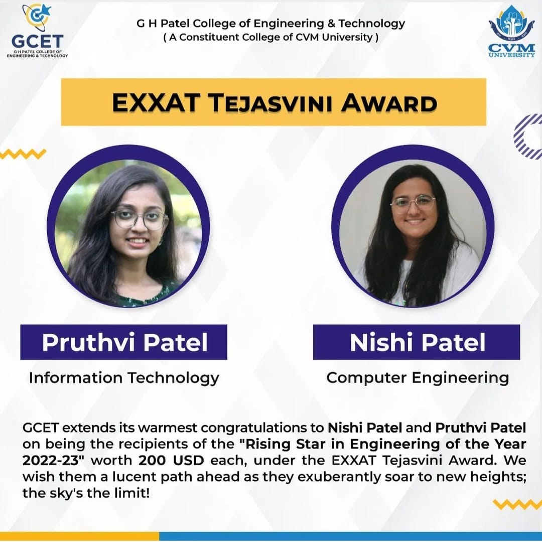 Pruthvi Patel received award Rising Star in Engineering of the year 2022-23 with scholarship of $200.