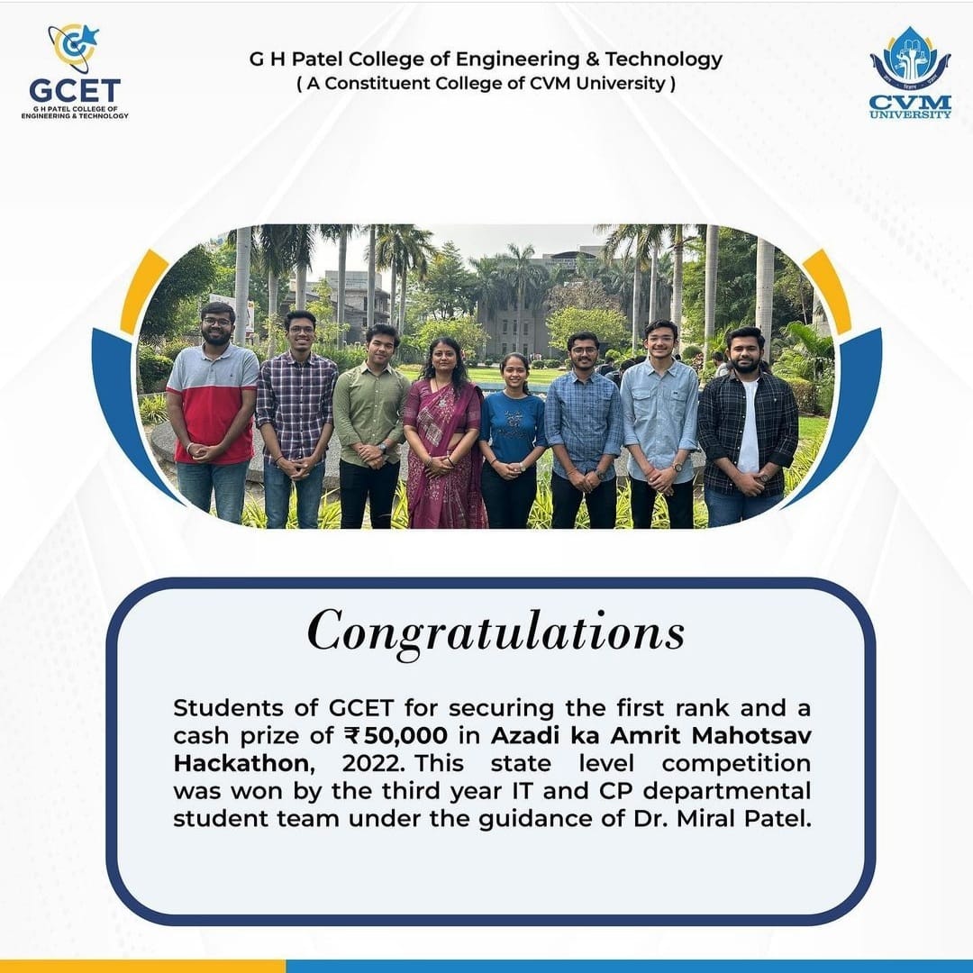 Het Patel, Pratham Shah, Armin Vaghasiya, Ayushi Patel, Kandarp Shah, Kirtan Prajapati, Vivek Chauhan) won the first prize worth Rs. 50K in Hackathon organized under SSIP.