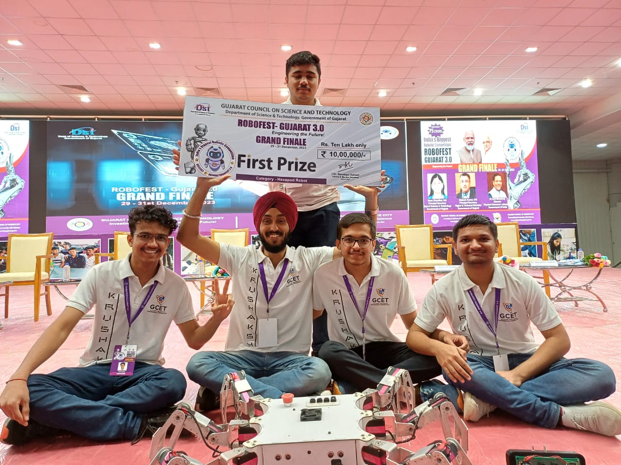 G H Patel College of Engineering & Technology (A Constituent College of CVM University), Vallabh Vidyanagar, proudly announces the outstanding achievement of its student team from GCET, comprising Gurmann Singh Bhullar, Devavrat Upadhyay, Soham Mistry, Urmil Prajapati, and Tapan Khanapara, under the expert guidance of Prof. Bhavik Ardeshana. The team has been honored with certificates and a special cash prize of Rs. 10,00,000/- by GUJCOST for their remarkable performance in the Robofest 3.0 Competition, specifically in the Hexapod category on 31/12/2023. Furthermore, the innovative prototype developed by the team has earned the privilege of being selected for display at the upcoming ROBOTIC Gallery at Gujarat Science City. This recognition not only highlights the exceptional talent and dedication of the students but also underscores the commitment to excellence in robotics at G H Patel College of Engineering & Technology. Congratulations to the team for this remarkable accomplishment! |