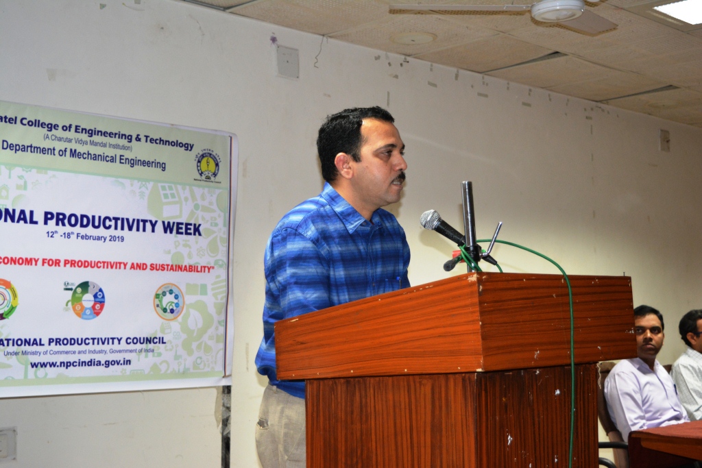 Mechanical Engineering Department of G H Patel College of Engineering & Technology celebrated National Productivity Week-2019 in Collaboration with National Productivity Council, Gandhinagar on 15th February, 2019. The theme for the same is “Circular Economy for Productivity & Sustainability”. Poster and Elocution competition were held on 8th and 15th February, 2019. We are thankful to National Productivity Council, Gandhinagar for sponsoring the prizes (3 each) to winners of the two competitions. Mr. Natarajan Pratap, Deputy Director, NPC, Gandhinagar was present during the event and he encouraged all the students through his speech.