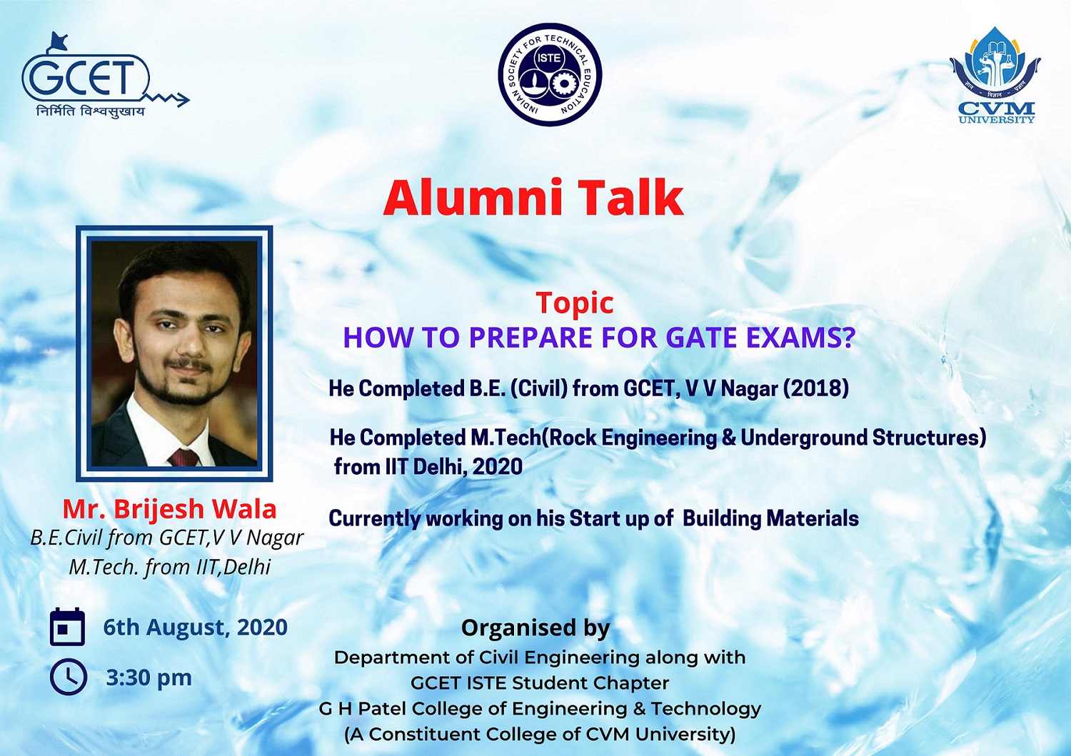 The department of civil engineering along with ISTE Student Chapter has organised an Alumni Talk on "How to Prepare for GATE Exam?" on 6th August, 2020. The Alumni Talk was conducted by the Mr. Brijesh Wala (2014-2018 Batch). The event was organized for the Civil Engineering students. More than 50 students attended this expert talk.