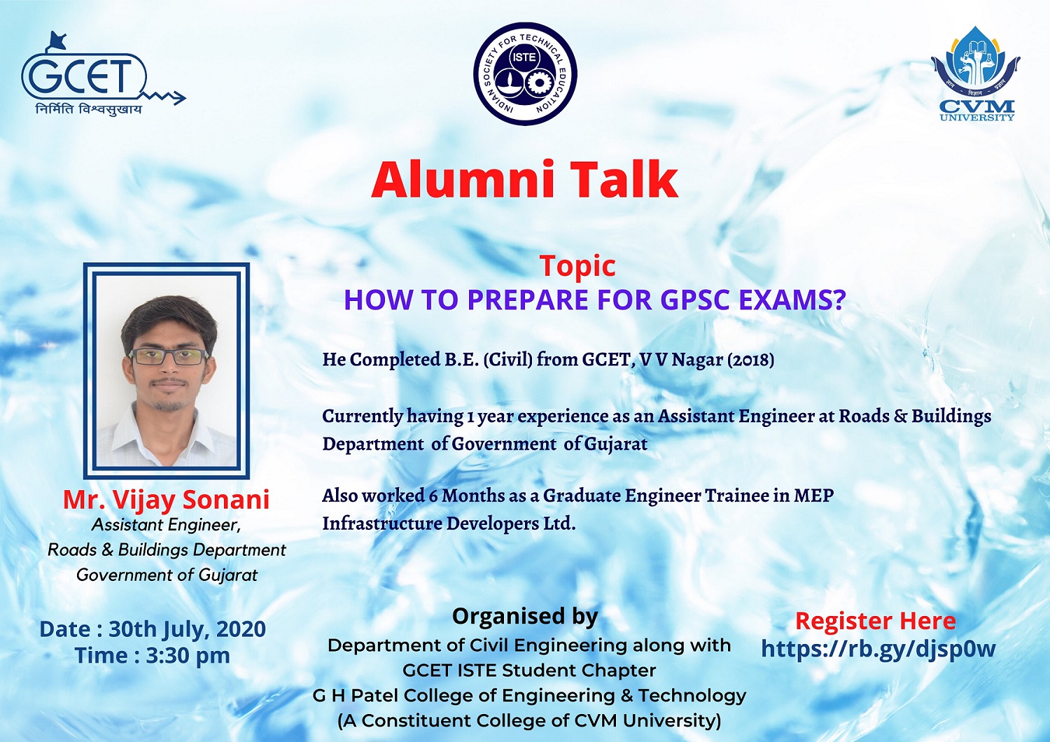 The department of Civil Engineering, along with ISTE Student Chapter, has organized an Alumni Talk on "How to Prepare for GPSC Exams?" on 30th July, 2020. The Alumni Talk was conducted by Mr. Vijay Sonani (2014-2018 Batch). The event was organized for Civil Engineering students. More than 100 students attended this expert talk. The motto of the event was to make students aware of Government Competitive Exams and how they can start preparation for it.