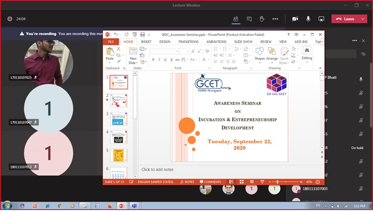 Department of Computer Engineering and Incubation and Entrepreneurship Development Cell (IEDC) of G. H. Patel College of Engineering and Technology (GCET) have jointly organized, “IEDC awareness seminar” on 22nd September, 2020 for 7th Semester Computer Engineering students. As a departmental IEDC coordinator of Computer Department, Prof. Brijesh Patel conducted this session.