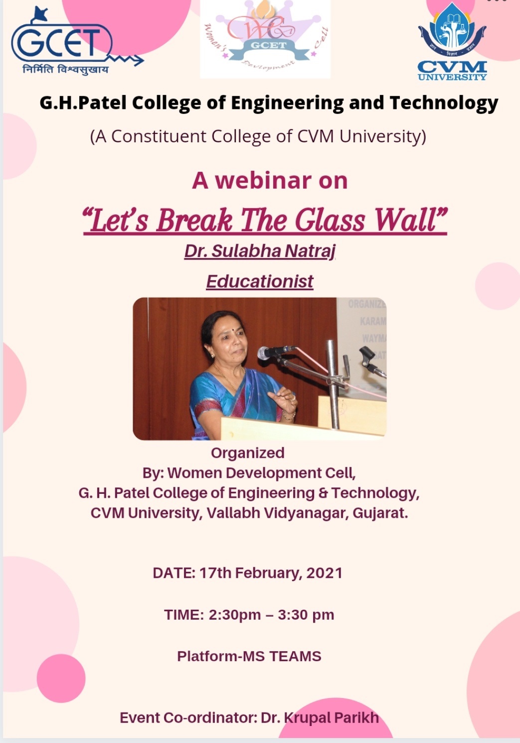 A webinar was organized by Women Development Cell (WDC), G H Patel College of Engineering and Technology (GCET) on 17th February, 2021 between 2:30pm to 3:30 pm for all female faculties and girl students of GCET.