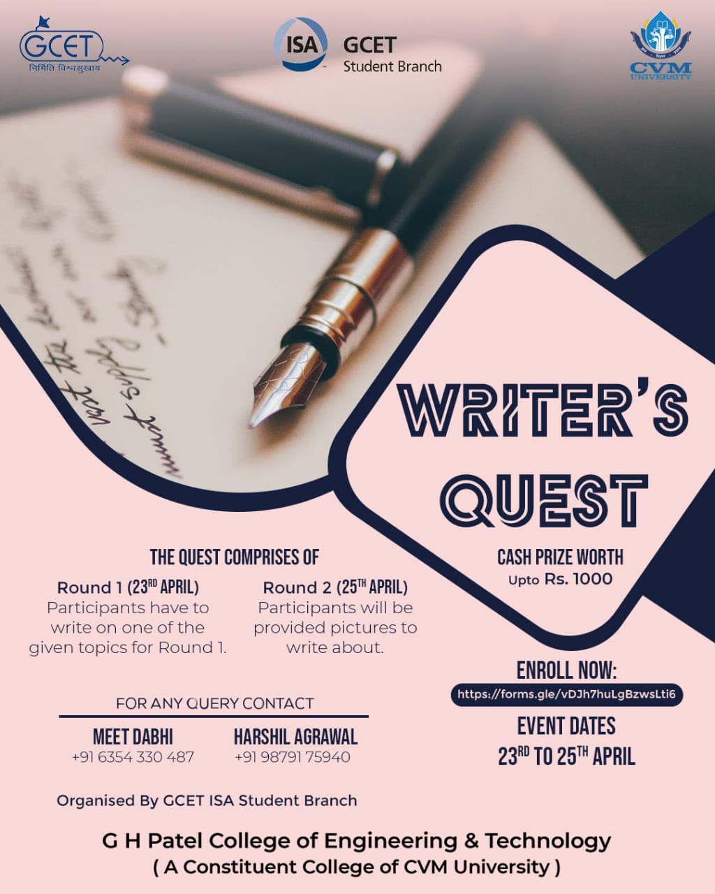 The GCET ISA Students’ Branch conducted an online event named “Writer's Quest.” The winners of this Quest were awarded with up to ₹1000. The event comprised of 2 rounds. The event took place between 23rd April 2021 to 25th April 2021. A total of 86 participants registered for the event. The student coordinators of the event were Meet Dabhi and Harshil Agrawal.