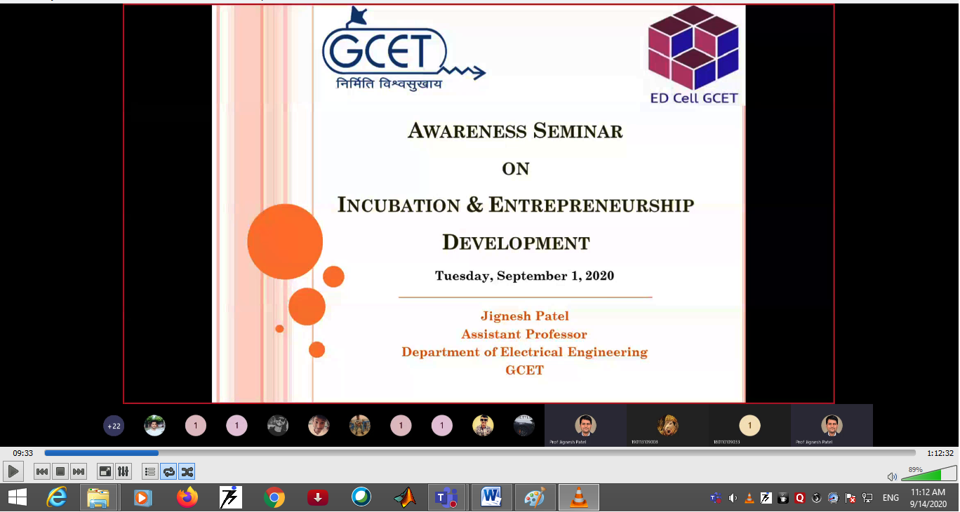 Under aegis of CVMU: ESII Cell, G. H. Patel College of Engineering & Technology, Vallabh Vidyanagar, Department of Electrical Engineering successfully organized “Awareness Seminar on Incubation & Entrepreneurship Development” on 1st September 2020 using MS Teams online platform.