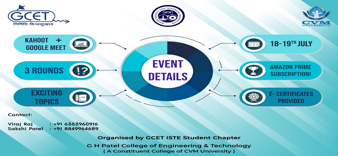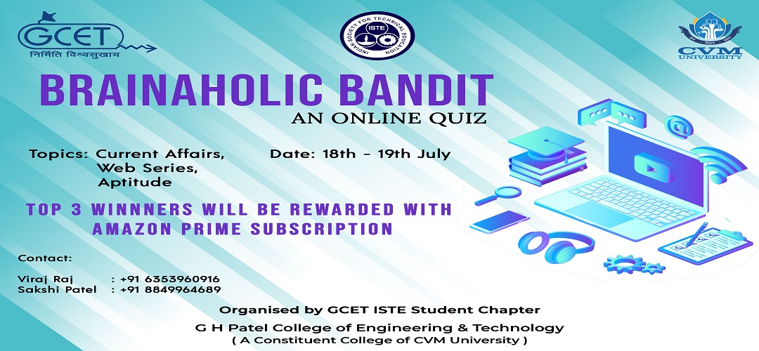 Brainaholic Bandits was a non- technical Quiz competition organized by ISTE (Indian Society for Technical Education) at G H Patel College of Engineering & Technology. It was an online quiz conducted on Google Meets and Kahoot platforms. The motto was to provide a break for the students from the stress of online classes in a fun-loving as well as knowledgeable way. Total 184 participants from all the departments have taken part in this Quiz Competition. The winners were awarded with an Amazon Prime Account.