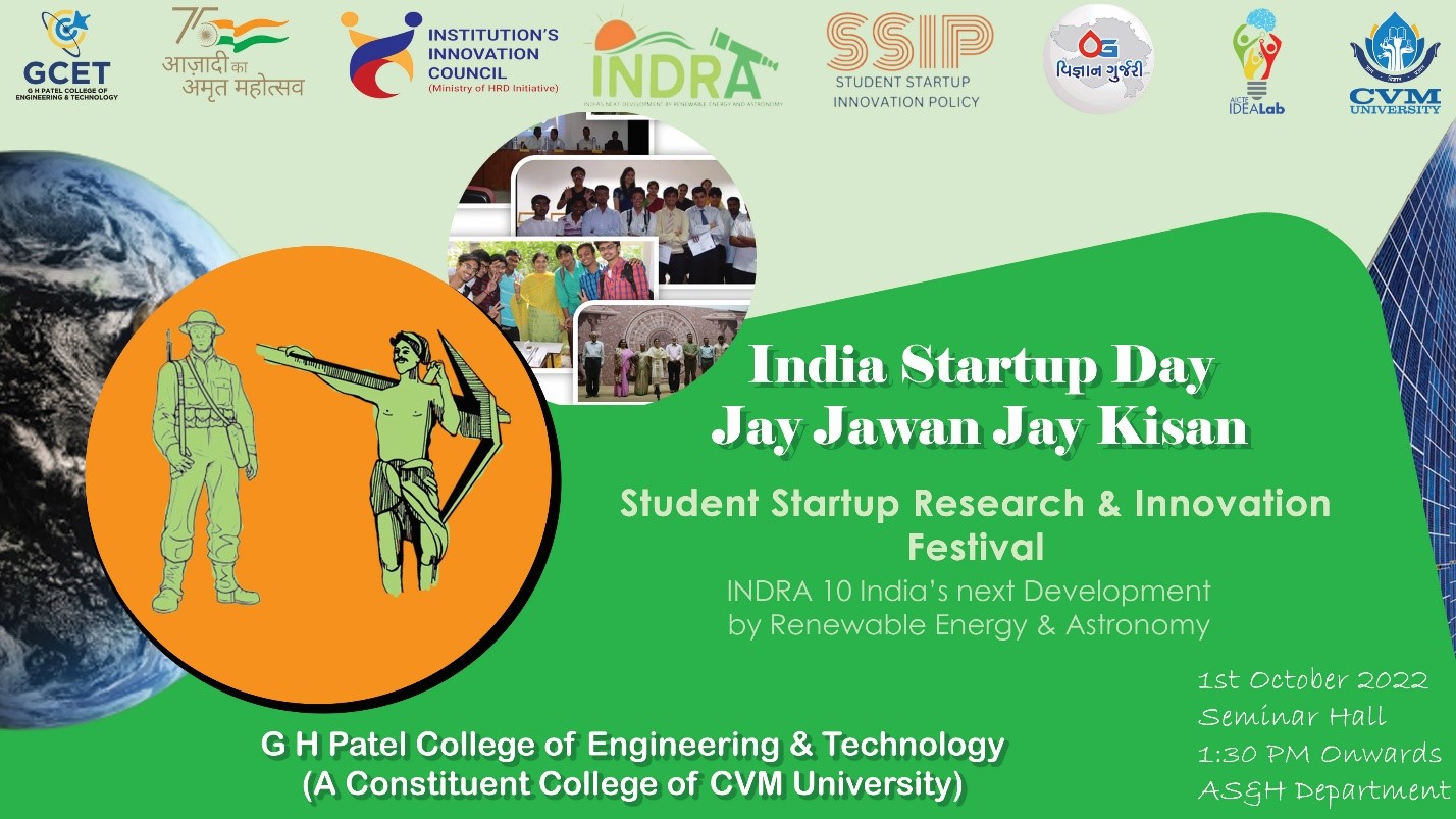 Event INDRA was organized on 1st October -2022 under CVM University by AS&H Department of GCET in which working models with solar energy were exhibited. The theme of this year’s celebration was “Jai Jawan Jai Kisan”. Total 230 participants of 1st year students from all the branches made working models using solar energy and demonstrated them.