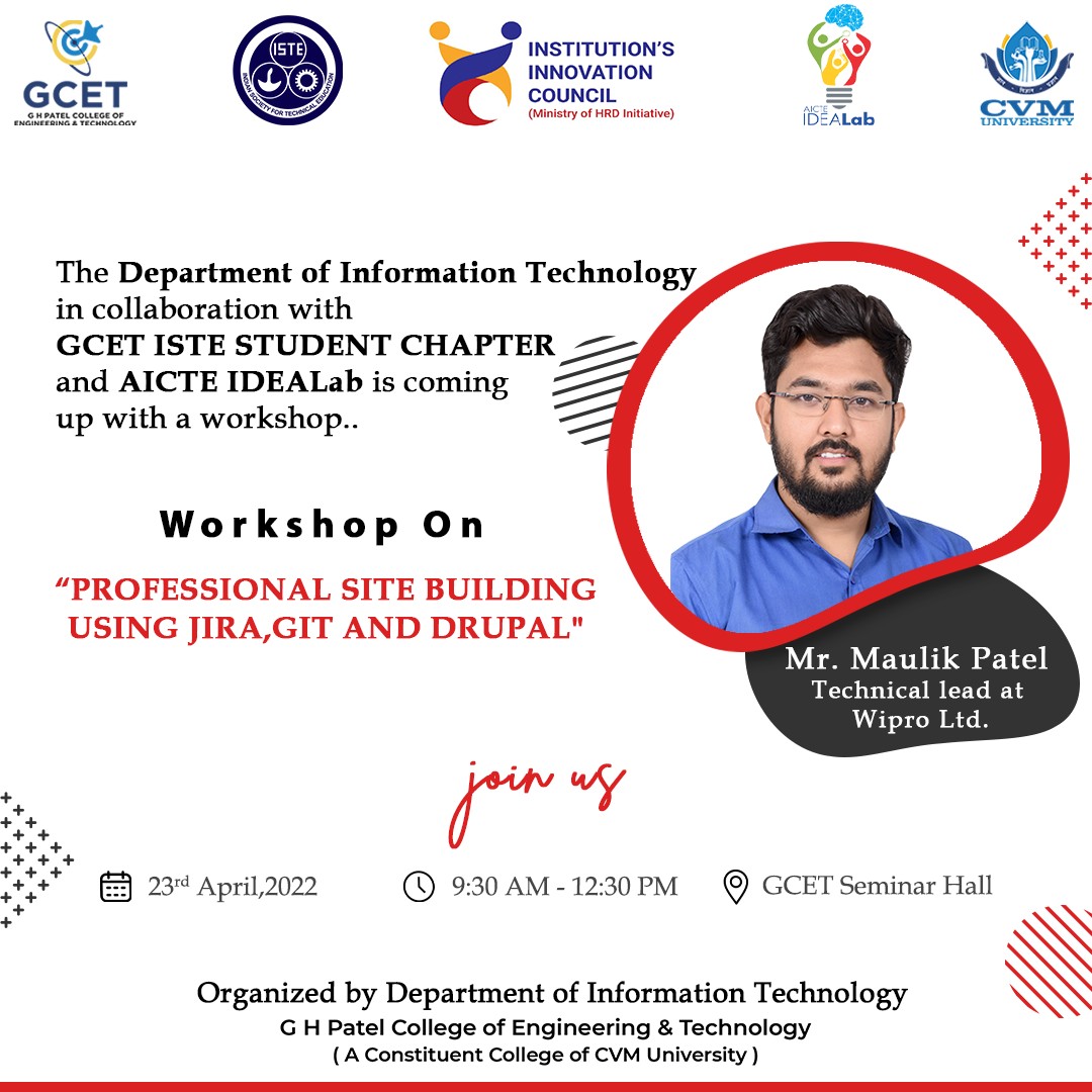 With the ever increasing competition in the ever growing field of technology, time and skills are the factors that play a pivotal role in deciding what one’s career graph can look like. It’s always an upper hand when one’s skills are in tune with what the industry requires and what the current education pattern fails to deliver. And to bridge this gap between industry and academia, Department of Information Technology in collaboration with GCET ISTE STUDENT CHAPTER ,AICTE IDEALab and IIC MHRD organized a workshop on “Professional Site Building using Git, Jira and Drupal” for the students of G H Patel College of Engineering & Technology.