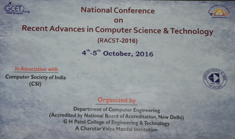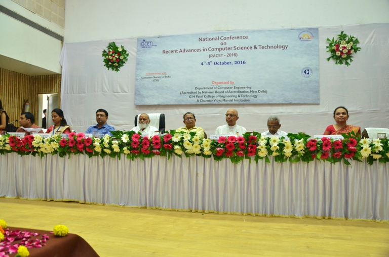 Department of Computer Engineering Department, G. H. Patel College of Engineering & Technology organized a National Conference Recent Advances in Computer Science & Technology (RACST-2016) in association with Computer Society of India on 4th-5th October, 2016. The aim of organizing the conference was to gather the academia with a common interest and exchange the most cutting-edge ideas in the field of Computer Science & Technology. The conference was inaugurated by Dr. C. L. Patel, Chairman, Charutar Vidya Mandal and Dr. Himanshu. S. Mazumdar, Professor, EC and Head, R & D center, DDU, Nadiad. Shri. S. G. Patel, Hon. Secretary, CVM, Shri V.M. Patel, Hon. Joint Secretary, CVM, Dr. N. D. Jotwani, Founder Principal, GCET and Visiting Professor, DAIICT, Gandhinagar. Dr. Himanshu Soni, Principal, GCET, Dr. Maulika S. Patel, Head, Computer Engineering Department, GCET, Convener of the conference and Organizing Secretaries of the Conference, Prof. Hetal Gaudani and Prof. Priyang Bhatt were also present. Off the dais dignitaries included Prof J. C. Panchal, Former Principal, GCET and Prof S. V Vaishnav, Founder Principal, ADIT.The Inaugural Address was given by, Dr. H. S. Mazumdar. He highlighted the importance of interdisciplinary research and relevance of such conference in the present era. He later gave a keynote talk on Computational Intelligence for interdisciplinary research and highlights of the dry chemistry lab at DDU. Dr. N. D. Jotwani discussed the application of computer in designing a solar PV Pump controller. Dr. C. L. Patel gave his Presidential Remarks and blessed the organizers and the participants. The third keynote lecture was on The Keynote Lecture on High Performance Computing by Dr. Vibha Patel, Associate Professor, Nirma University, Ahmedabad. On the second day there were two sessions on Image processing and Video manipulation by Dr Sumantra Dutta Roy, Associate Professor, IIT Delhi. The third session of the day was on Some Technologies after 100 years: Trends and Impact and Big Data by L. M. Patnaik, Adjunct Professor and INSA Senior Scientist at NIAS, IISc Bangalore. The last keynote talk was by Dr. Anish Mathuria, DAIICT, Gandhinagar on Evolution of stack-based control hijacking attacks. Technical paper sessions were conducted on both days after thekeynote talks. Total 20 papers were presented on various technical topics. The technical sessions were chaired by Dr. Darshak Thakore, Professor and Head, Dept. of Comp., BVM, V. V. Nagar,Dr. Priti Sajja, Professor, Post Graduate Dept. of Comp. Sci., SPU, V. V. Nagar and Dr. Narendra Chauhan, Professor & Head, Dept. of IT, ADIT, V. V. Nagar.The conference concluded with the valedictory and certificate distribution by Dr. Himanshu Soni and Dr. Anish Mathuria. On 6th October, 2016, Dr. L. M. Patnaik had interaction with faculty members and discussed various areas on which research can be done. Also,the student's interaction session with Dr. L. M. Patnaik was arranged. He advised the students to take internships at IITs and also prepare for public sector jobs. He also discussed the importance of the GATE exams. Dr Patnaik concluded by mentioning that both faculty and students need greater exposure to the outside world and organizing and attending such events are extremely useful.