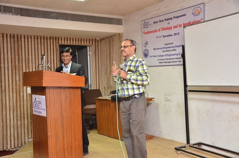 The program was supported by ISTE and IE (I) Vallabh Vidyanagar Local Centre. Total 15 speakers were invited to deliver / share their expertise in the domain of tribology. The invited speakers were Dr. Harish Hirani (IIT – Delhi), Dr. Tarunedra Singh (BPCL), Mr. SPRS Negi and Mr. Pratik Bhrambhatt (FAG Bearings), Mr. Amit Ganguli (Ducom Industries – Banglore), Dr. K N Mistry (Principal –GIDC Engineering college), Dr. D V Bhatt (SVNIT – Surat), Dr. R V Upadhyaya (Charusat University), Dr. Bharti Rehani (M S University) and Dr. Mukesh Bulsara (Professor, GCET). Total 34 participants attended the program from various engineering colleges across the country. The inauguration of the programme was conducted in the presence of Shri V M Patel (Hon. Joint Secretary, CVM), president of the function, Dr. K N Mistry (Principal, GIDC Engineering College), Chief Guest of the function, Dr. Himanshu Soni (Principal, GCET), and Dr. Darshak Desai (Head – Mechanical Engg. Dept.).