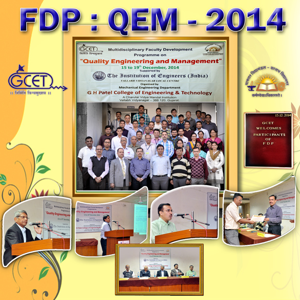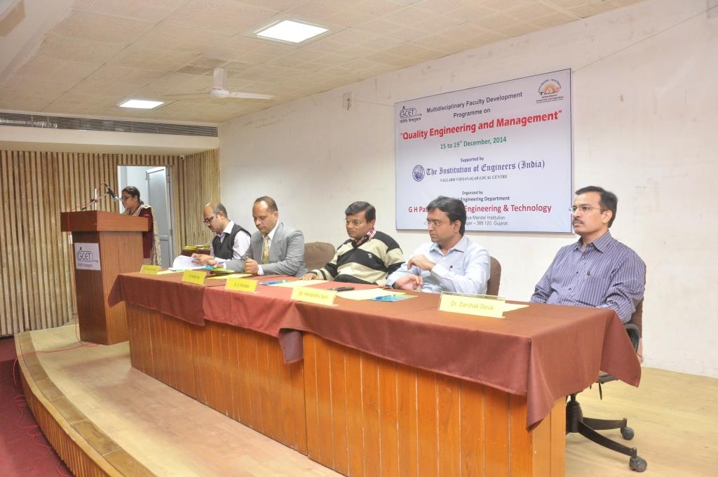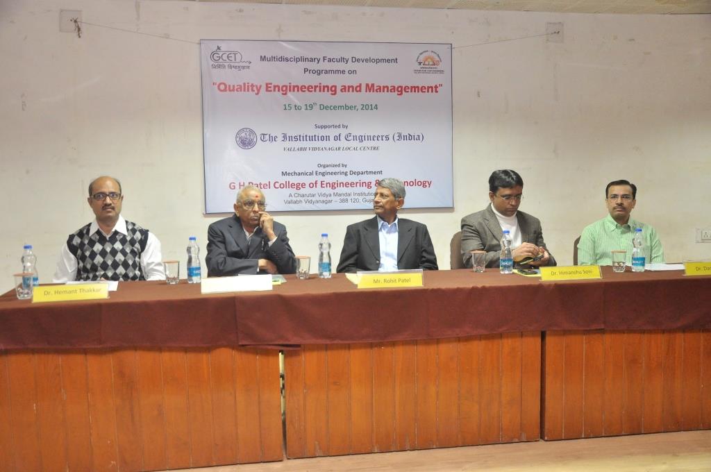 G H Patel College of Engineering & Technology organized a Faculty Development Program on "Quality Engineering & Management" during 15th to 19th December 2014. Total 42 faculties from different engineering colleges participated in this training program. The program commenced with the blessings of Dr. C L Patel, Chairman, Charutar Vidya Mandal. Shri Rohitbhai Patel, Chairman Milcent Group of Companies and MLA, Anand, Gujrat graced the occasion as Chief Guest of inaugural function. He emphasized on the importance of quality in industries and every walks of life. Principal S M Patel, Hon. Secretary, CVM and Dr. Himanshu Soni, Principal of the institute appreciated the initiatives of the Mechanical Engineering Department and congratulated all faculty participants. Shri D M Patel, President, Elecon Group of Companies also addressed participants and discussed about their new establishment of Bhanubhai Memorial Center for Excellence (BMCE). This five days multidisciplinary faculty development program was fully sponsored and supported by The Institution of Engineers (India), Vallabh Vidyanagar Local Centre.
