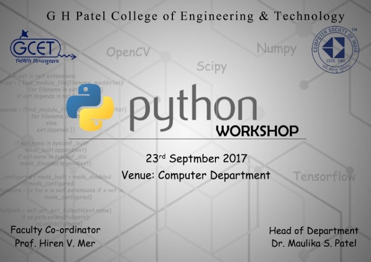 Department of Computer Engineering had organized a Python Programming Workshop under the Computer Society of India, Student chapter at G.H. Patel College of Engineering and Technology (GCET), V.V. Nagar (region III) on 23rd of September 2017. The workshop was organized for the 1st, 2nd, 3rd year students of Computer Engineering and Information Technology Branch,GCET. Total 24 students from CP, IT and other branches have registered for this Workshop. The workshop began at 12:30 pm in which 24 students have participated.Ms KiratiBhuva shared her Experience of Infosys as Developer and guided students to learn new things and to prepare for the campus.Ms KiratiBhuva discussed about the different technologies then she has started workshop on Python programming.